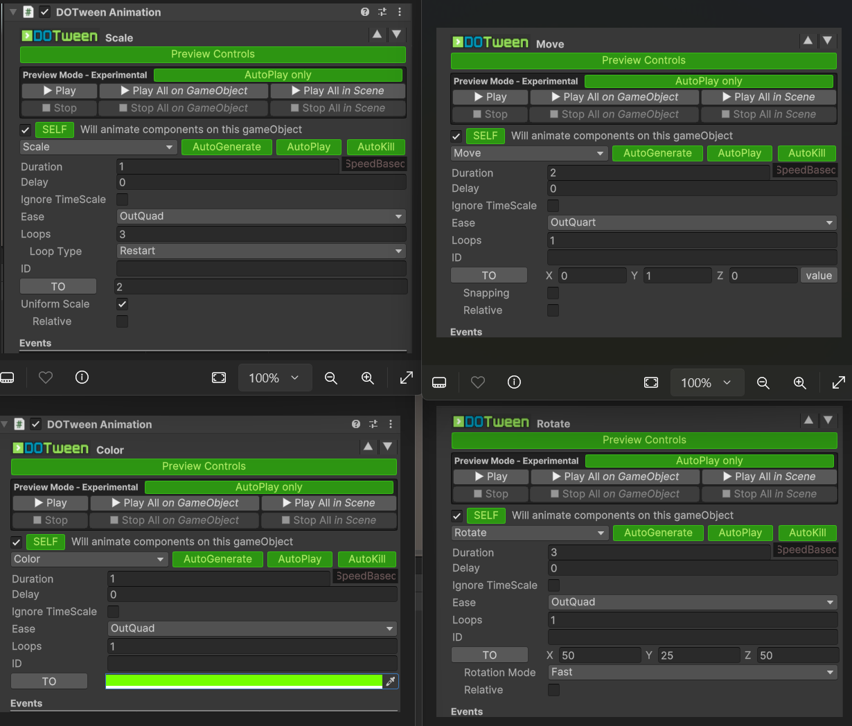 Play All in Scene을 누르면 추가한 모든 DoTween Animation들의 동작을 볼 수 있습니다.