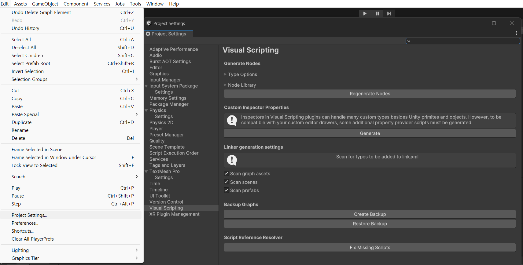 Edit -> Project Setting -> Visual Script로 들어갑니다.