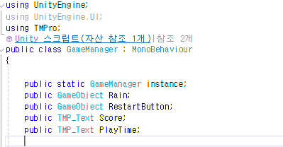 TextMeshPro를 사용하려면 위에 using TMPro; 를 적어줘야 합니다.