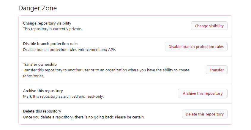 원하는 Repository -> Settings - >맨 아래 Delete로 Repository 삭제 하면 됩니다.