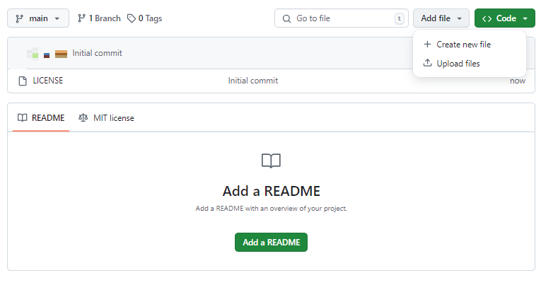 Creating a new file을 누르거나, Uploading an existing file을 눌러 추가하면 됩니다.