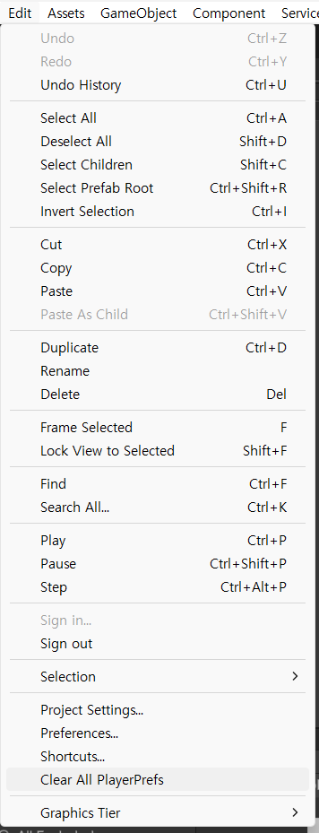 playerPrefs.DeleteAll(); // 모든 Key 전부 삭제