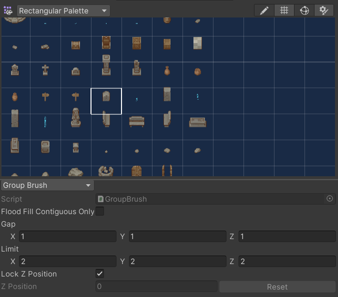 만든 타일들은 기존 방식과 같이 타일 팔레트 위에 올린 후 사용할 수 있습니다.