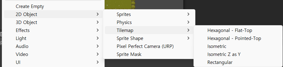 Hierarchy창에서 우클릭 - 2D object - Tilemap을 통해 만들 수 있습니다.