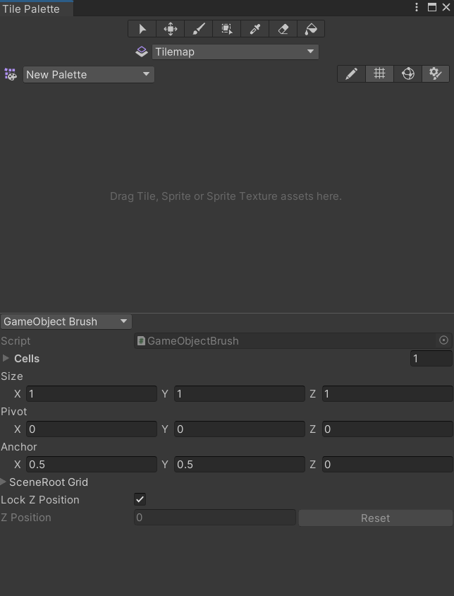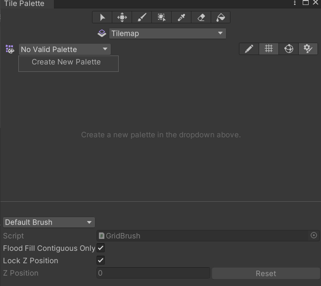 이제 타일맵을 채우기 위한 이미지들을 담을 타일 팔레트를 만들어야 합니다.