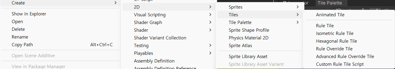 만드는 방법은 window - 2D - Tile palette를 누르면 됩니다.