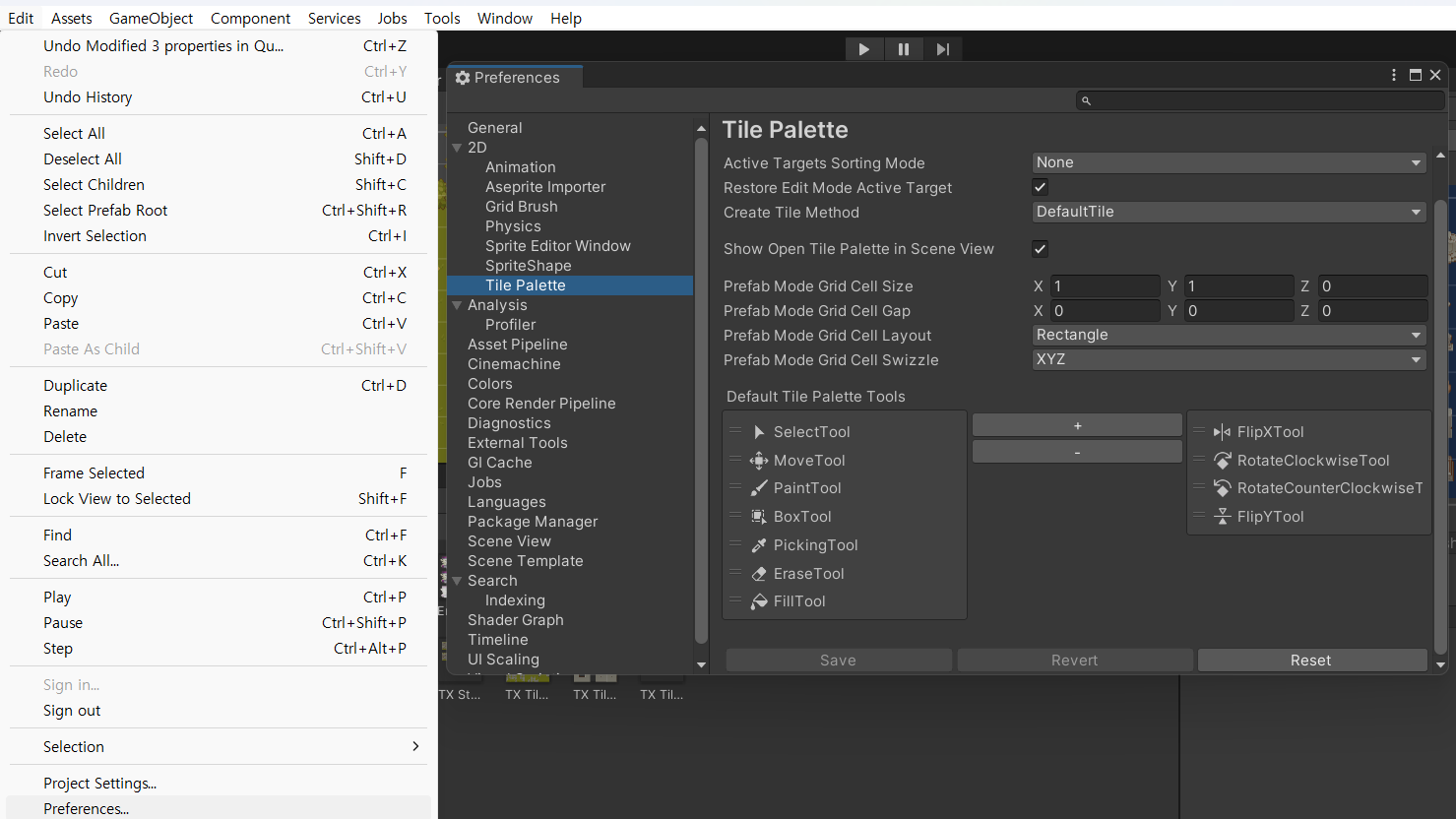 Edit - Preferences - Tile Palette에 가보면 여러 가지 추가 기능들이 숨겨져 있습니다.
