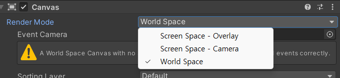 canvas는 기본으로 ScreenSpace-Overlay로 설정되어 있는데,