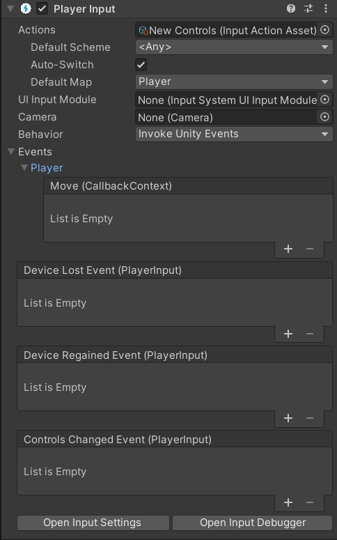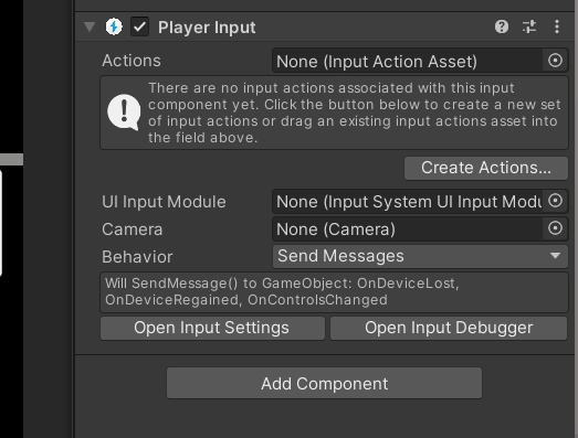 PlayerInput을 추가해 주고 여기에 만들어둔 Input Action을 등록해 사용하면 됩니다.
