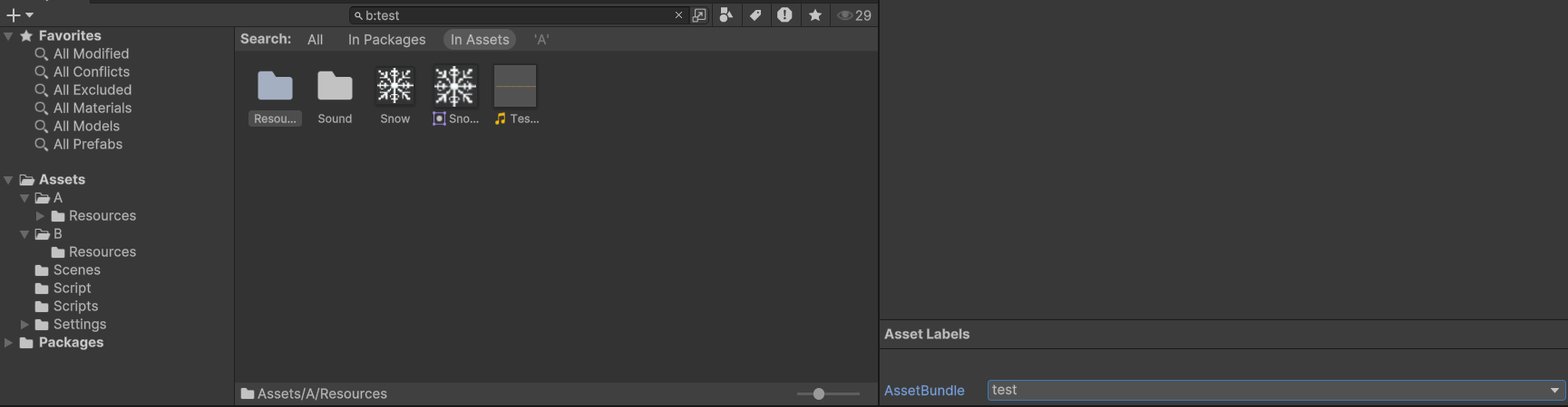 A라는 폴더를 누른 채로 AssetBundle을 만들었습니다.
