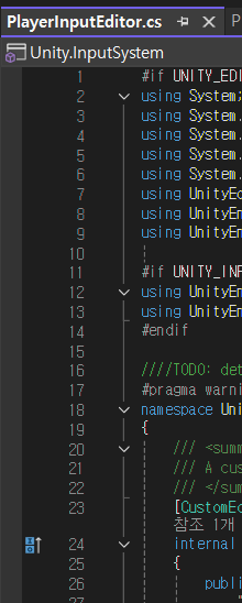에러를 클릭하면 다음과 같이 PlayerInputEditor.cs에 접근할 수 있습니다.