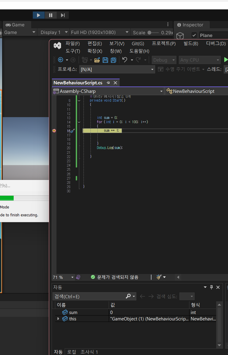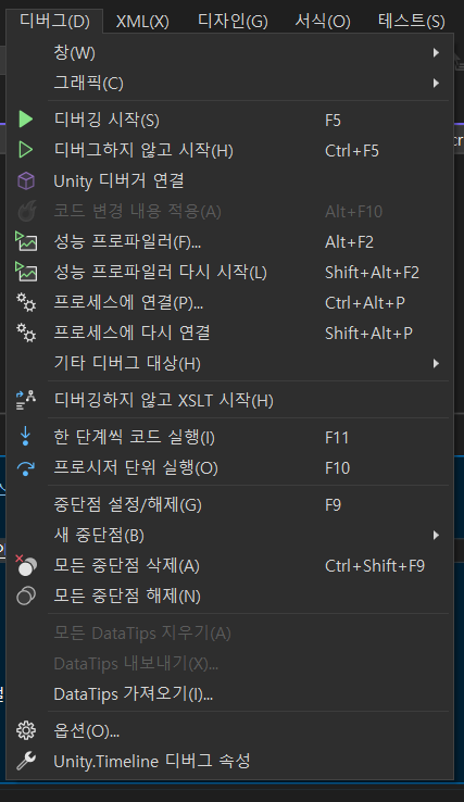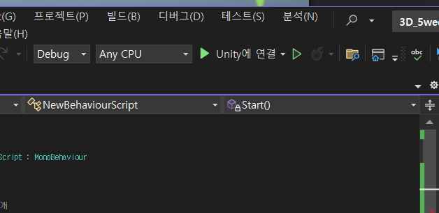 중단점을 설정한 후 유니티와 연결 버튼을 누르면