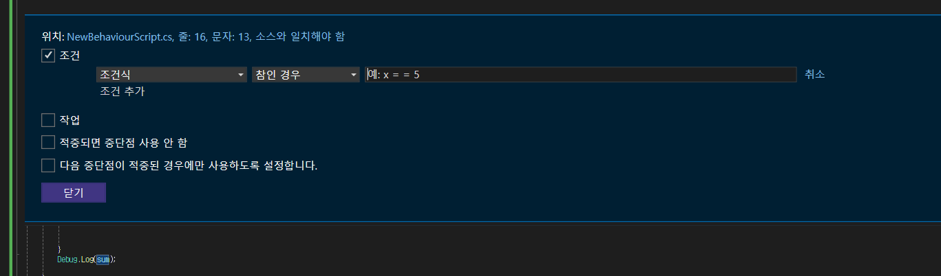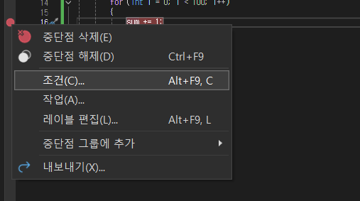 조건 설정 방법은 중단점에서 우클릭하면 조건을 걸 수 있는 창이 뜹니다.
