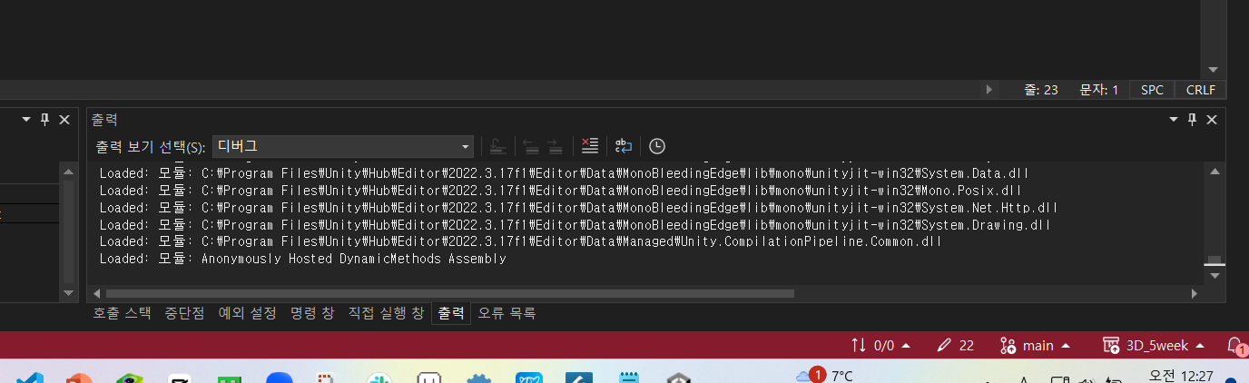 (우측 하단에 출력이라고 적혀 있는 부분을 자세히 보시면 호출 스택이라고 적혀 있습니다.)