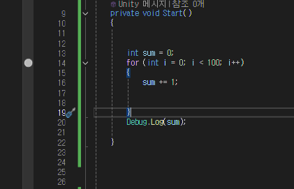 중단점을 찍는 방법은 원하는 줄 위치를 클릭 후 F9를 누르거나
