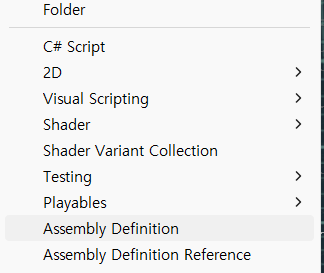 우클릭 후 Assembly Definition을 클릭하면 DLL 파일을 생성할 수 있습니다.