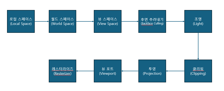 렌더링 파이프라인의 초기 과정부터 레스터화 까지의 과정을 축약한 그림입니다.