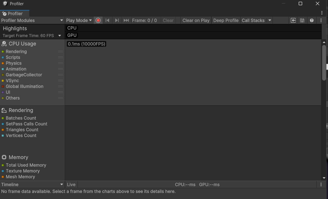 Unity 프로파일러에 액세스하려면 Window > Analysis > Profiler 로 이동하거나 키보드 단축키 Ctrl+7 (macOS의 Command+7)을 사용하십시오.
