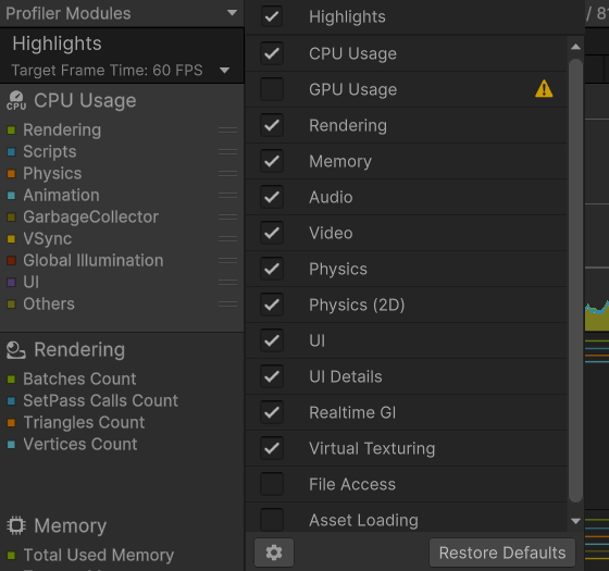 기본적으로 프로파일러는 게임의 마지막 300 프레임을 기록하고 보관하며