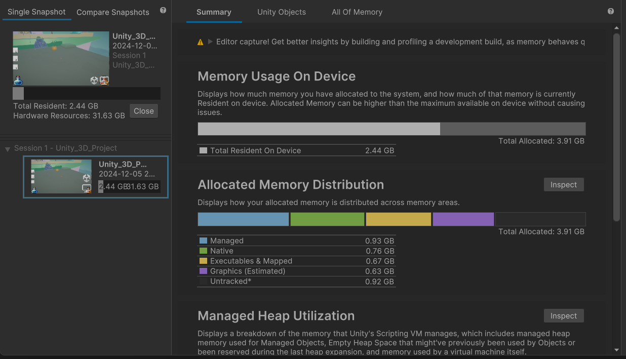 Unity 메모리 프로파일링 툴 사용 방법 | Unity