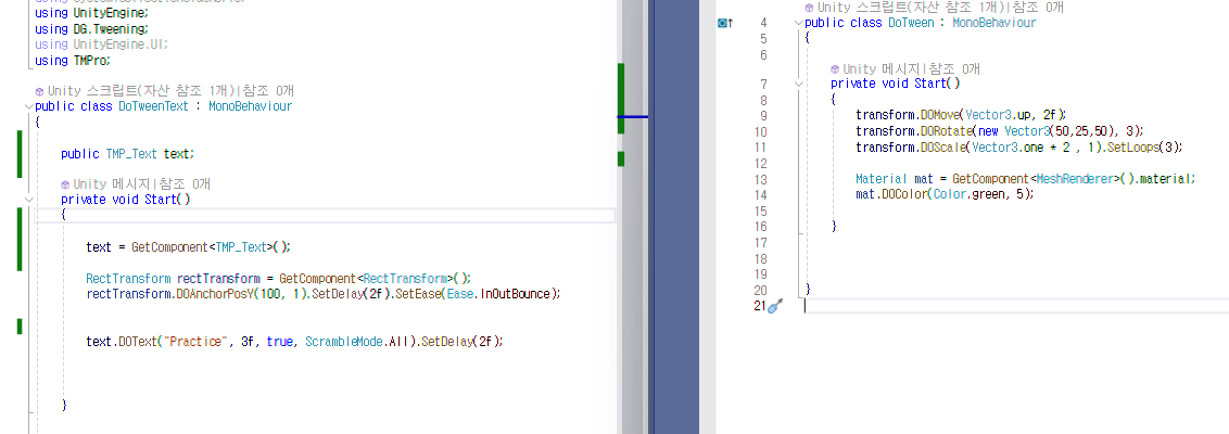 오늘은 DoTween과 Visual Scripting(이하 UVS로 통일)을 활용하여UI 연출을 해보도록 하겠습니다. 간단하게 버튼을 누르면 숫자 1000이 올라가는 코드와다시 0으로 돌리는 코드를 작성해 봤습니다. 우클릭을 통해 On Button Click과 Set Text를 추가했습니다. 이때 주의할 점은 Text가 있고, TextMesh가 있고,TextMeshPro가 있고, TextMeshProGUI가 있습니다. Text는 Legacy의 Text고,TextMeshProGUI가 TextMeshPro에서의 Text입니다. DoTween의 무료 버전에서는 TextMeshPro를 지원하지 않기에 상황에 맞게 사용하면 됩니다. UVS에서 Button을 사용하기 위해서는 Inspector창에도 Bu..